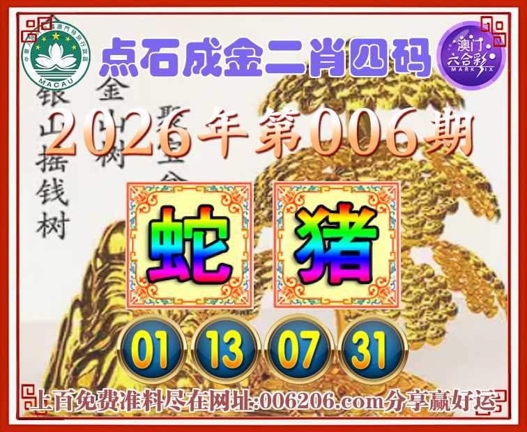 006期:《点石成金》  ♣️二肖四码 ♣️【猪】【01.13.07.31】开:蛇13准公开见证