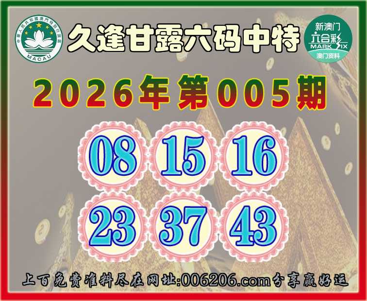 005期:【久逢甘露】 🚵‍♀️六码中特🚵‍♀️【08.15.16.23.37.43】开:43准公开见证